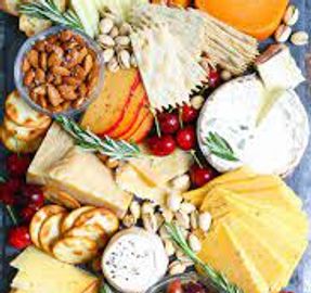 Five types of cheese, served with fresh seasonal berries, seedless grapes, toasted almonds, pickled vegetables, marinated olives, fig preserves, and a variety of crackers.